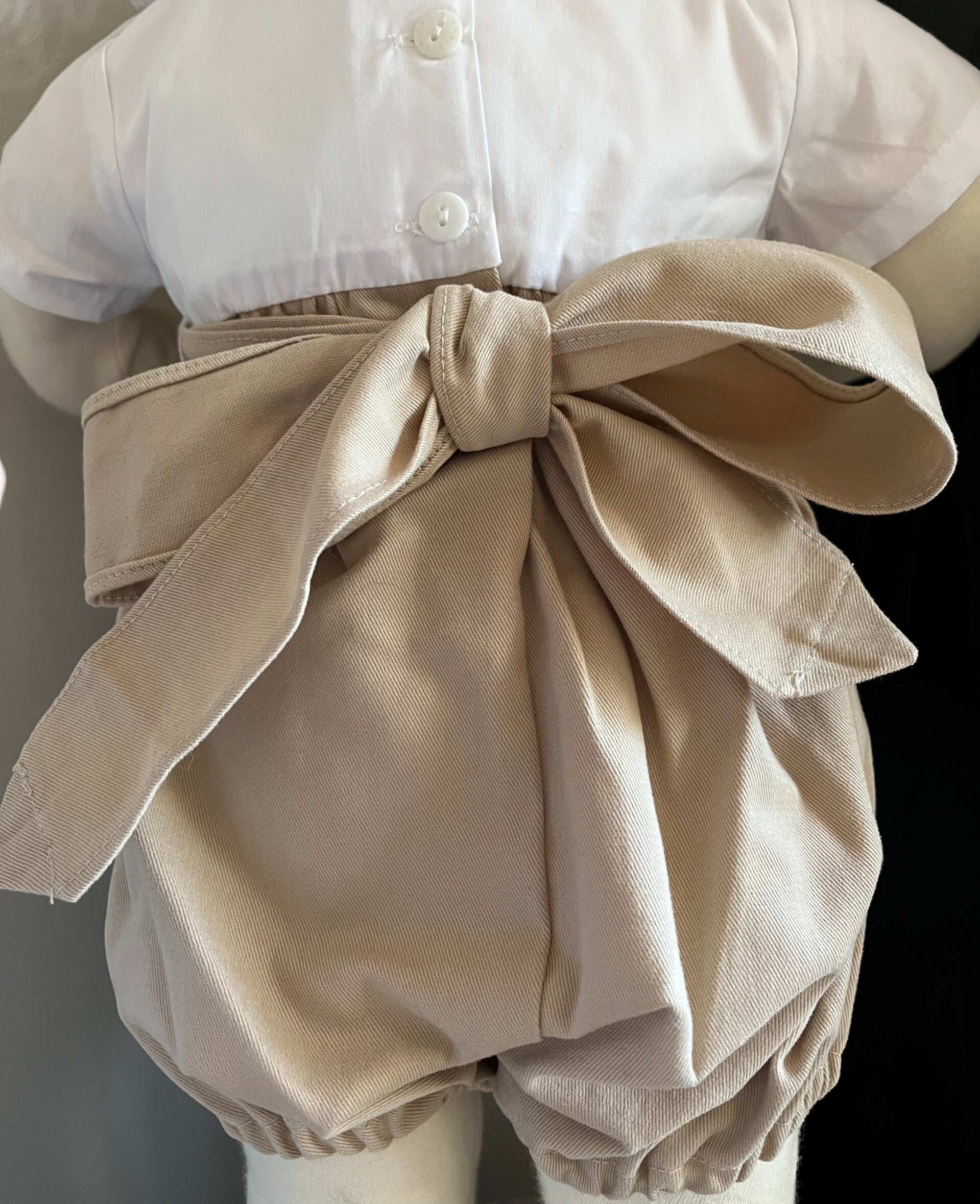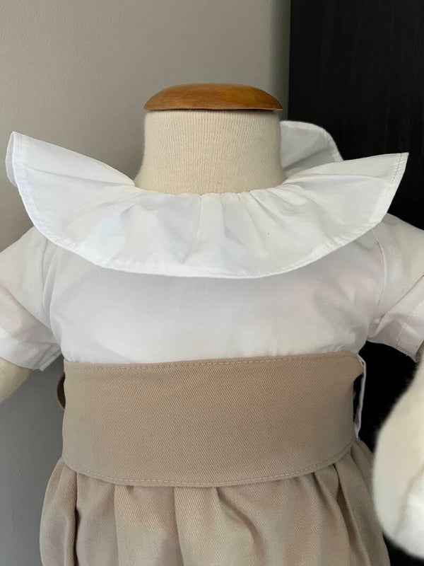 Prachtige beige romper met witte volant kraag en bovenlijfje. Een mooie strik op de rug maakt deze romper helemaal af! 100% katoen
