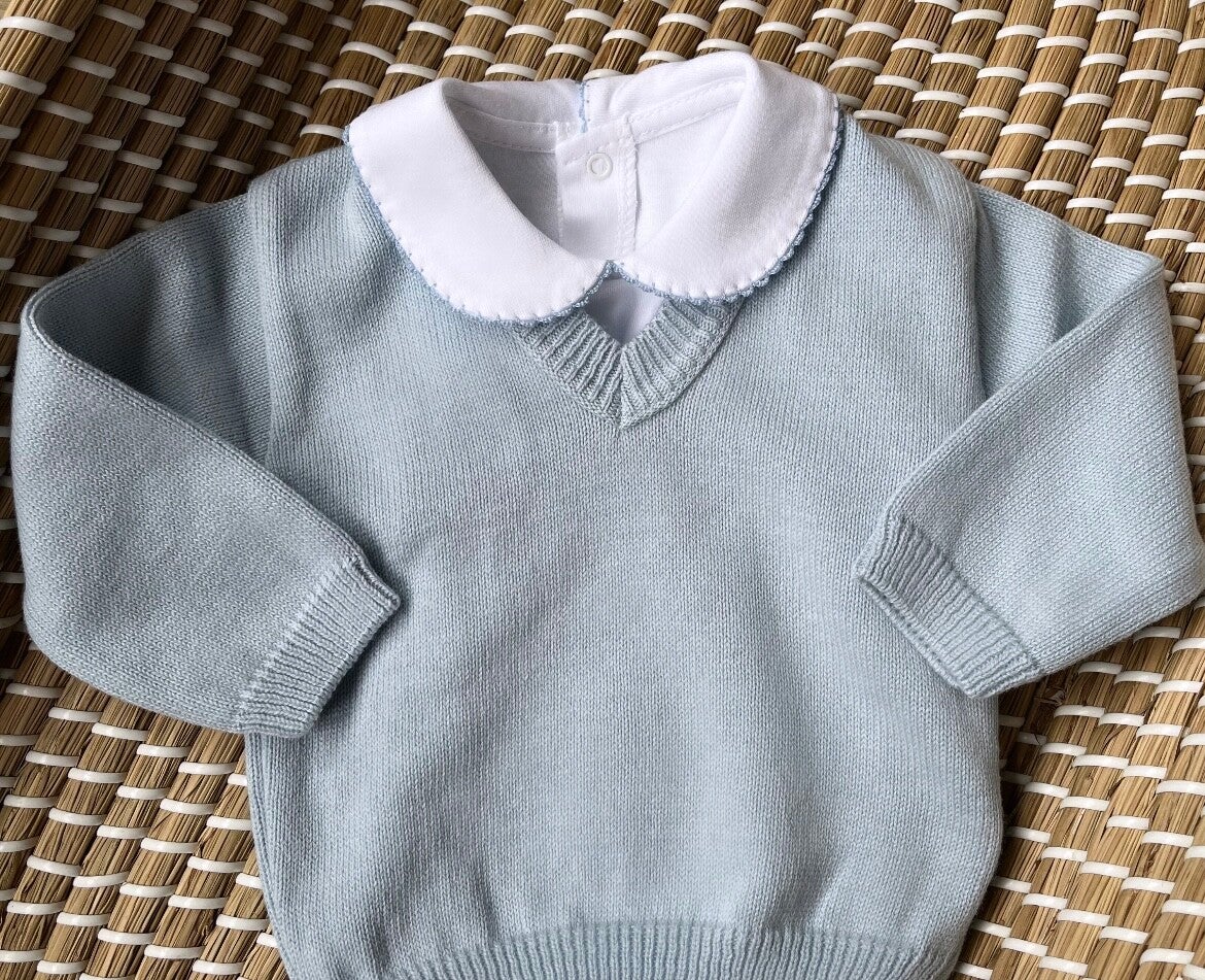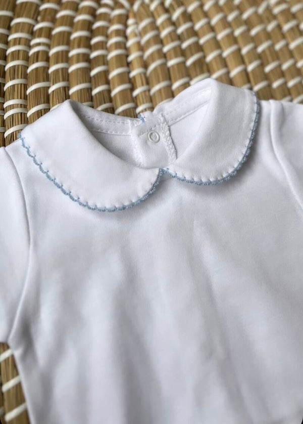 Wit katoenen babyromper met blauw stiksel bij de kraag.