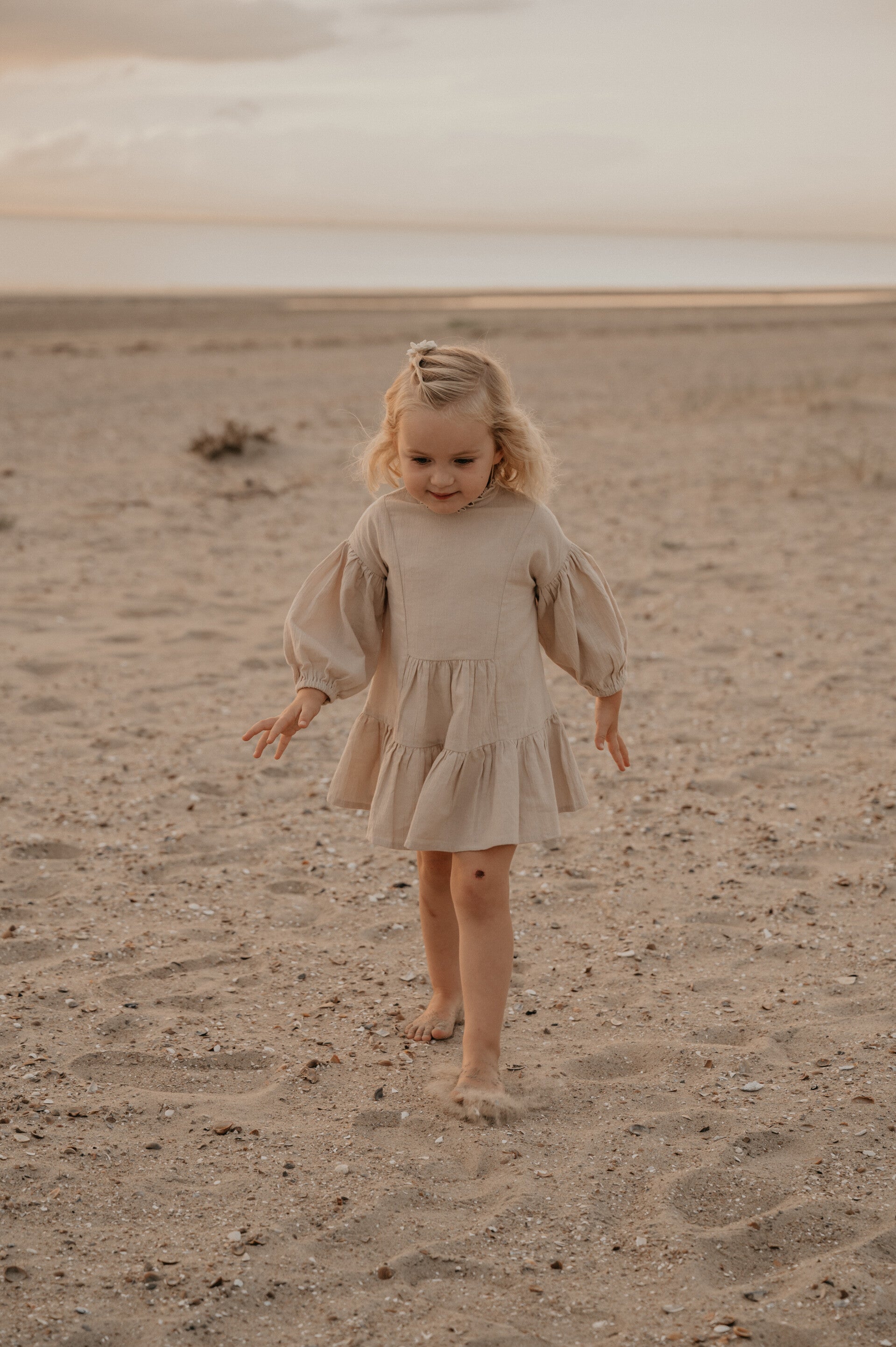 Maha dress kleur Sand met ruches aan de halslijn en ballonmouwen.