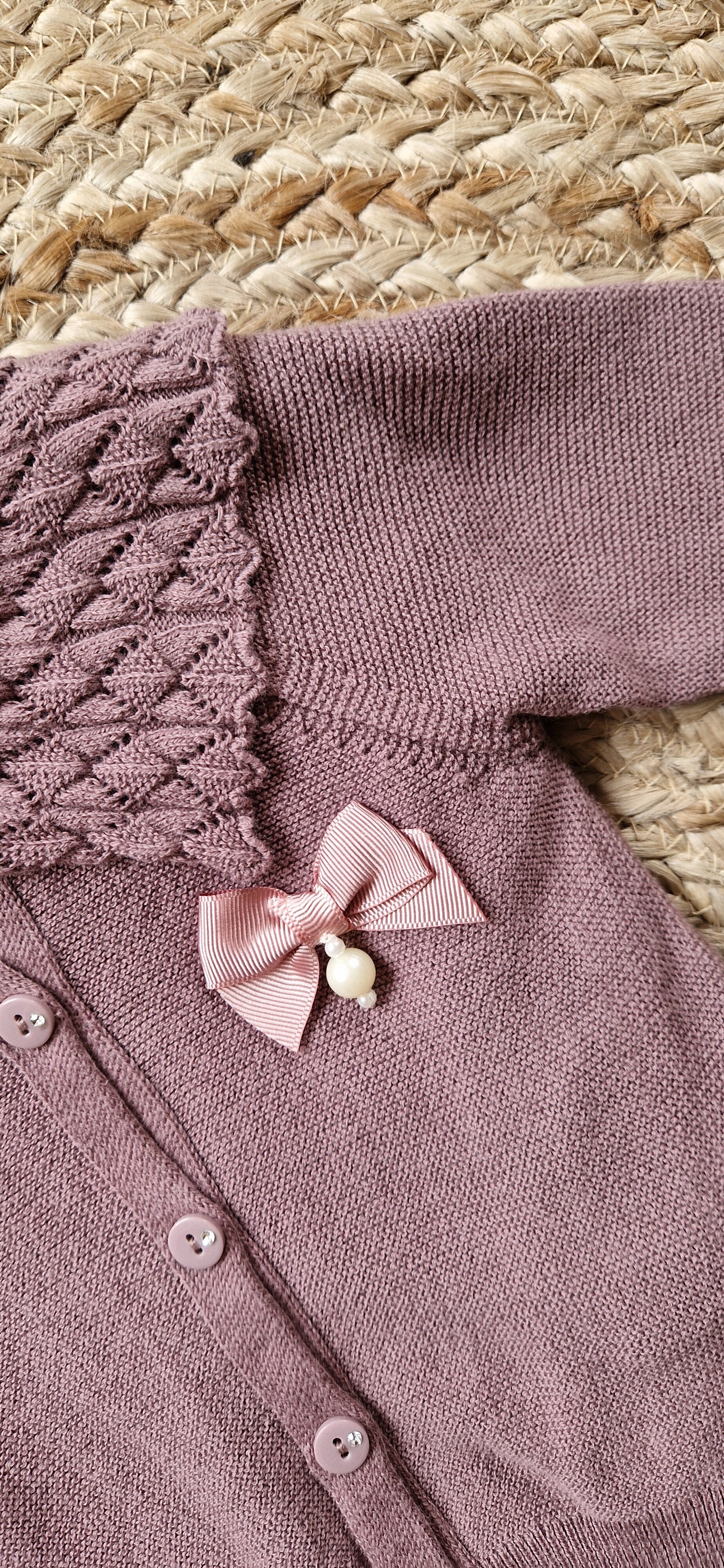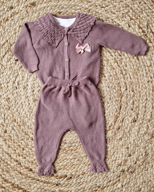 Dit prachtige gebreide set bestaat uit een romper met lange mouwen, een vestje met mooie kraag en strik en een broekje erbij.