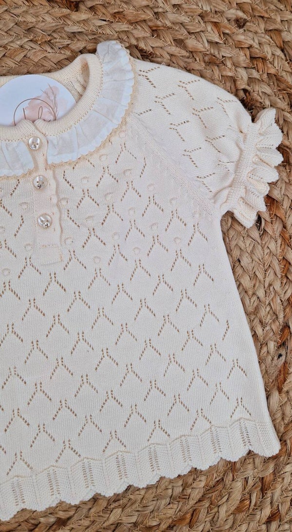 Dit mooie gebreide babykleding setje van 100% katoen heeft mooie details, zoals het ajour, een mooie kraag en schattige mouwtjes. Het setje heeft korte mouwen en is heerlijk luchtig voor een warme zomerdag.