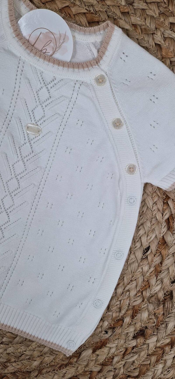 Dit prachtige klassieke babysetje is tweedelig en gebreid van 100% katoen tricot. De neutrale kleuren en mooie opengewerkte details maken het een super stijlvol pakje. Gebreide pakjes voor jongens zijn de trend van dit jaar voor stoere babies! Door de korte mouwen en korte broek ideaal voor de zomer en heerlijk comfortabel.