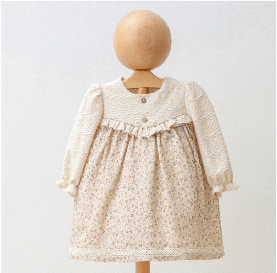 Crèmekleurige a-lijn jurk subtiel reliëf bloemenpatroon, versierd met twee houten knoopjes.