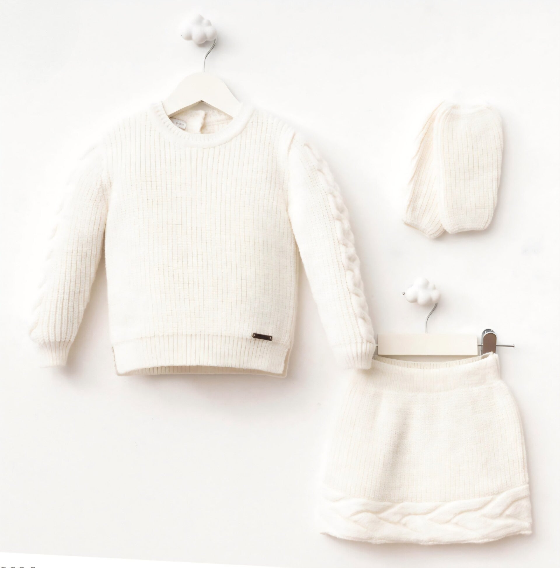 Gebreide 3-delige set – trui, rokje & beenwarmers