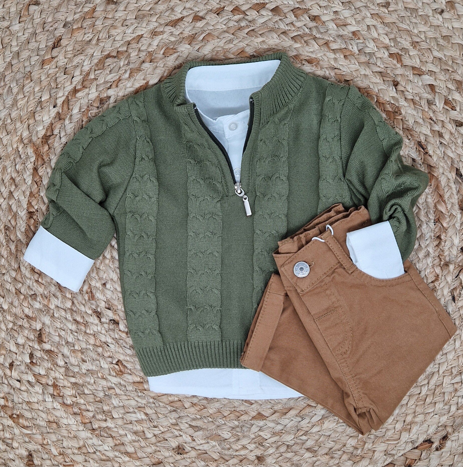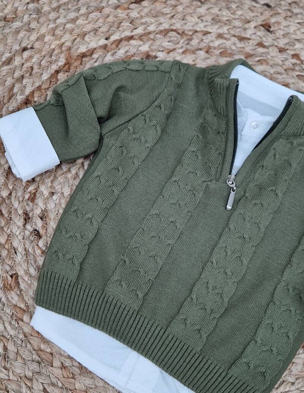 Stoere jongenstrui groen met kabelpatroon met witte blouse eronder.