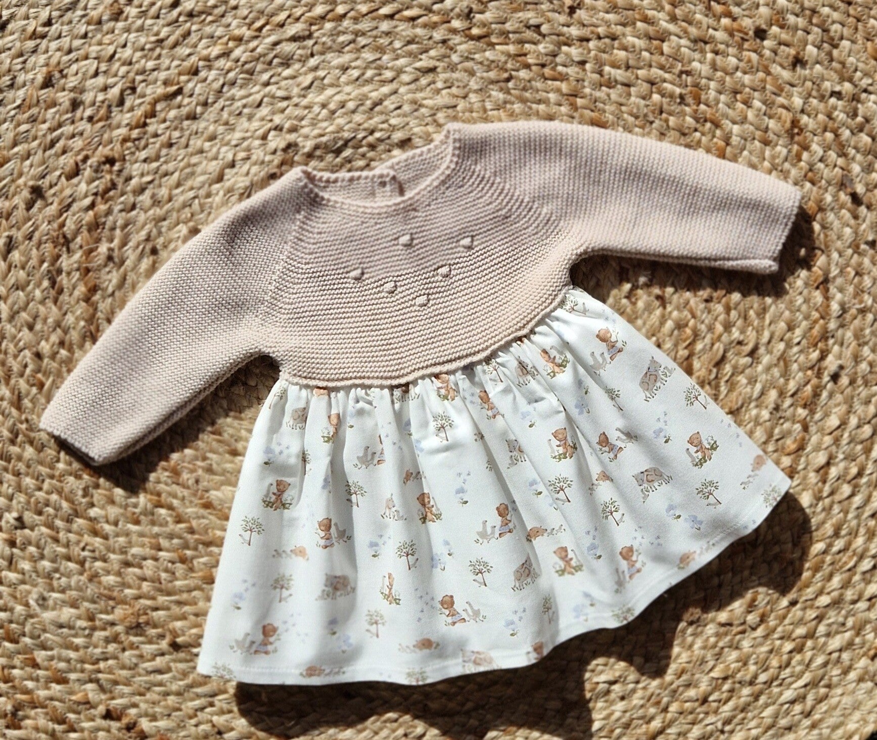 Het bovenstuk is fijn gebreid in een zachte, beige-roze tint en voelt heerlijk warm aan voor de koelere dagen. De rok is gemaakt van een luchtige, witte stof met een lieflijke print van beertjes en bloemen in zachte pastelkleuren.