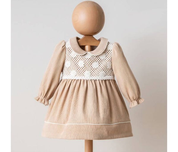 Vervaardigd uit zachte, camelkleurige baby corduroy stof, biedt deze jurk warmte en een rijke textuur.