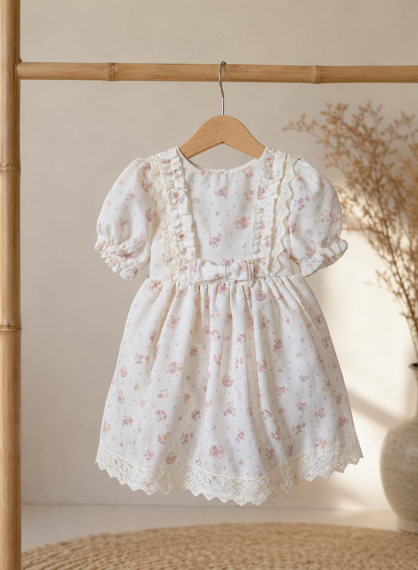 Op de voorzijde lopen sierlijke ruches met kanten details, wat het jurkje een extra elegante en nostalgische touch geeft. In de taille is het jurkje licht geplooid voor een mooi vallend rokje, afgewerkt met een decoratieve strik. De onderrand is voorzien van een fijne kanten zoom die het geheel stijlvol afmaakt.
