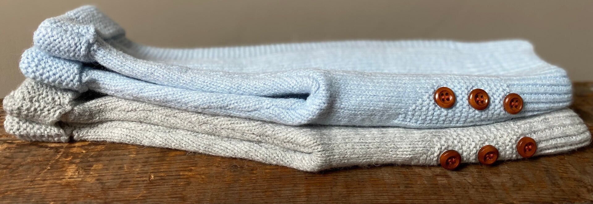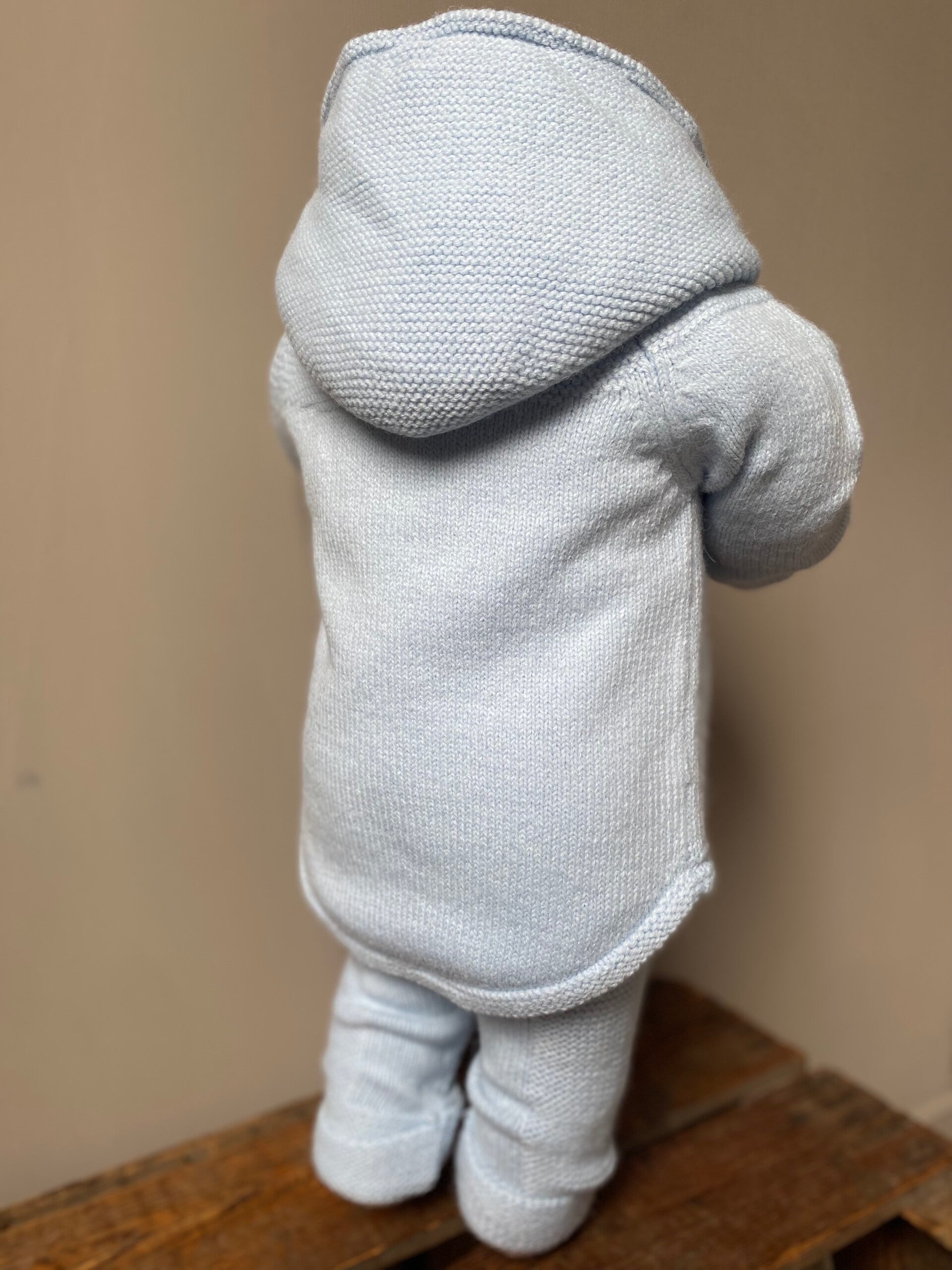 Babyoutfit van een zachte, gebreide stof. Jas met kabelpatroon en houten knoopjes.